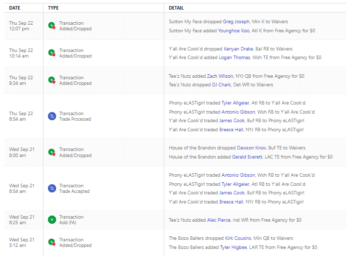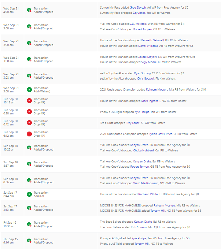 10. Commish – (previous ranking: 9) – Week 2 of the Geno Smith experience has not treated John well. His hit list has been put on pause like a mafioso who’s gotta go to “school” for a little while. His team played pretty well and he still got stomped by Bellz. Mike WiLL made (his week bearable). The Bozo Battle this week will be must-watch. Next week we could see the return of TradeMasterJ.