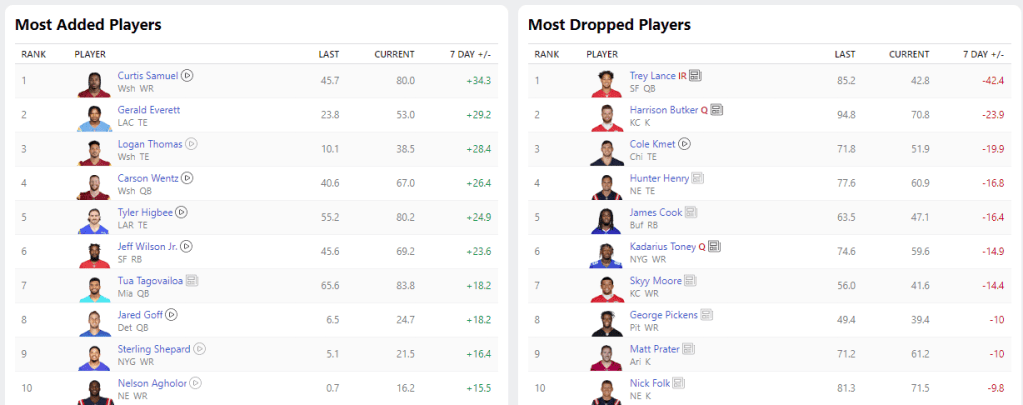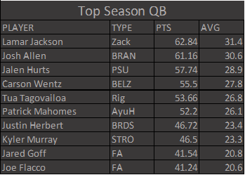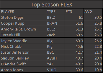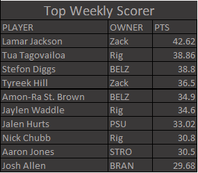 3. Bookie Z – (previous ranking: 1) – Well, I caveat-ed (is that a word) my position of Zack’s team last week by pointing out that Ekeler, Etienne, and Pitts had bad days. Unfortunately for him, they (along with Chase) had bad days again. This is starting to look like a #Trend. Not worried because of the pedigree, but enough to knock him down a few pegs. Lamar and Tyreek wont push 40 pts every week to carry him.