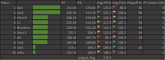 1. King Phony – (previous ranking: 2) – Dan’s squad is on top this week after another easy 125 point performance. If he can consistently put up 125, the league is officially #OnNotice. A trade just to trade with Tom is risky when you are on top, but it appears to be a re-shuffling of the deck more than anything. As Shrooms would say “I’m fine widdit.”