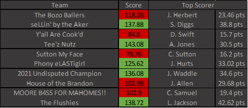 Both of you bums failed to score 90 points, let alone breaking 100. In a 2 flex league…. Turns out JJ can be stopped and Tom’s team looks about as inconsistent as StrohL’s. Just like Tom’s team name… Ya’ll Are Cook’d!