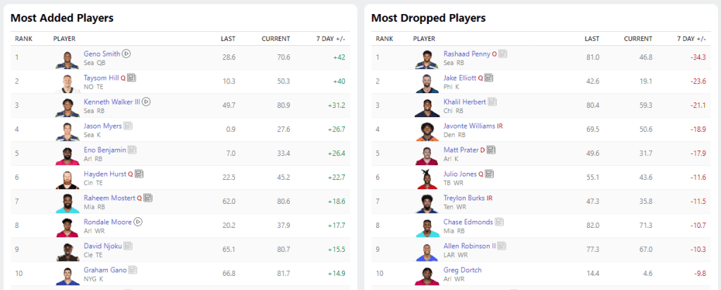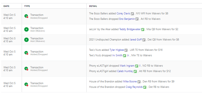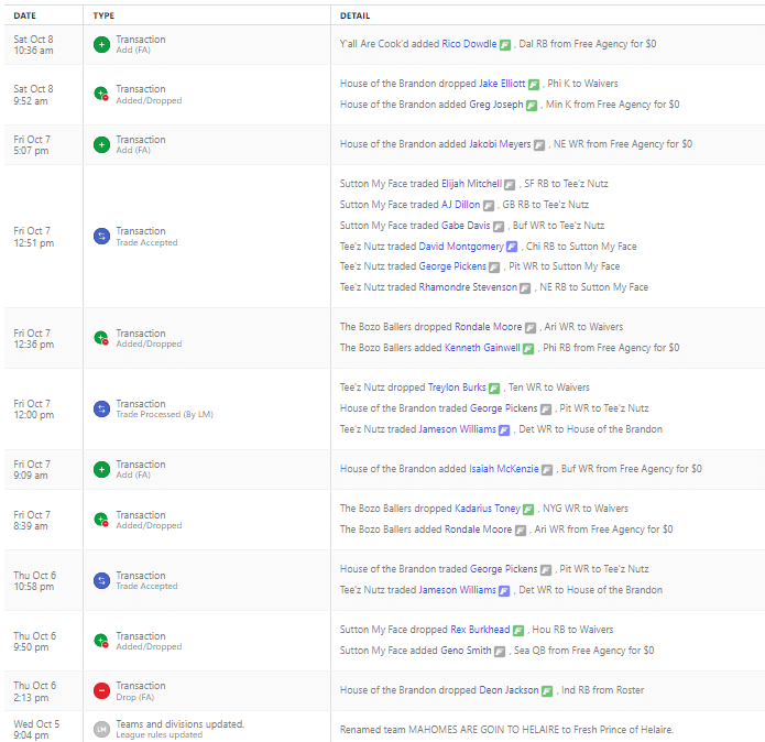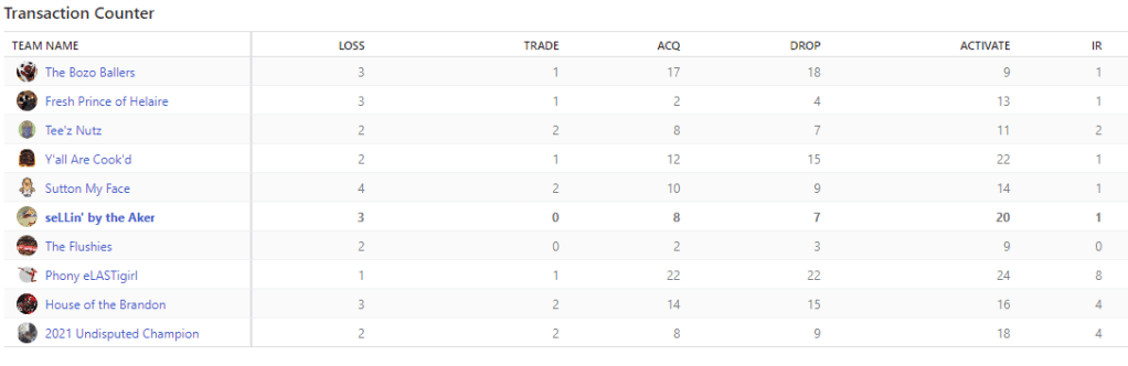 3. StooL – (previous ranking: 4) – It’s a good thing this league doesn’t have relegation, because I would probably have been pushed to your semi-competitive work league after a horrendous 2020, then into your 8-team family league with your grandma (where players like Jaylen Waddle and Miles Sanders are available on waivers) after my nearly as terrible 2021. But so far this year, I feel like I’m an upper mid-standings team. I’m fine here but I’m hoping to make the playoffs and then anything is possible.