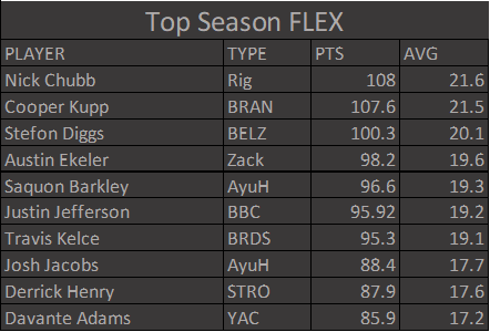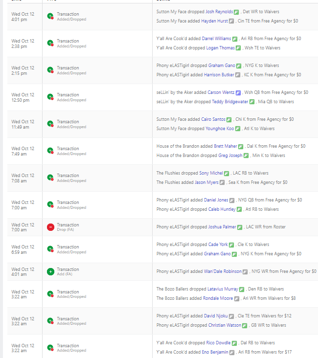 4. King Phony – (previous ranking: 2) – Don’t look now, but Dan’s team has recently hit a rough patch. Less than 115 (the new 2 Flex League “Standard” IMO) three weeks on the bounce. He had to start Devin Duvernay and Elijah Moore last week. He will get a few WRs back in the next few weeks, but another injury or two and the upcoming bye weeks spell trouble. Starters are still really solid though and if he can make it to the playoffs healthy, or scrounge up a flex or two, it could be the proverbial “Scary Hours.”