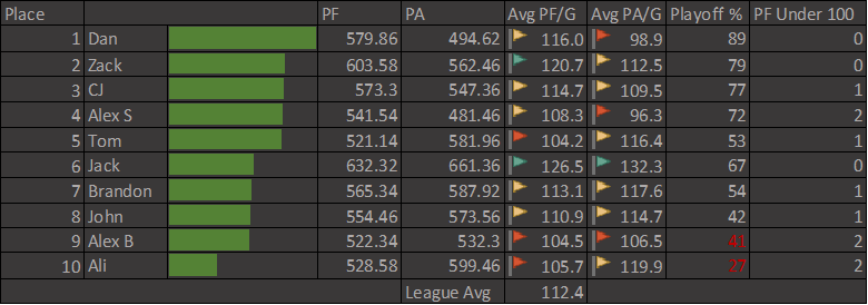 While some have started hot like King Phony and some cold like the Champ (life comes at you fast) these jumbled standings won’t last. Mr. Attack leads in both PF and PA but sits at 2-3 (been there) and Dan the Man looks loaded at RB, but has the second lowest PA only to Strohly Pohly Ohly. Because of course. Meanwhile Tommy Toes is 3-2 with the LEAST amount of PF. So there’s that.