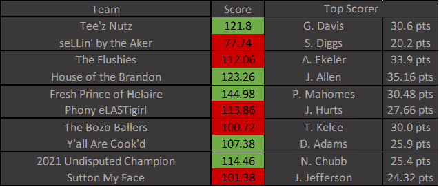 5. Bozo – (previous ranking: 9) – Started from the bottom now we here. Jack is proof that two weeks is a long time in fantasy football. Back-to-back weekly high scores is eye popping. Josh Jacobs is looking like a league winner. We all laughed when Jack picked him. We gotta own that. If Jack puts up another top score this week, he could easily be moved into the top 3.