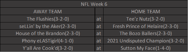 7. Mr. Jody Fortson – (previous ranking: 7) – Brian Robinson is officially the starter. The Breece Hall trade with Dan from week three is looking worse and worse. Tom has a major hole at RB until Cordarelle and Swift come back. Tom’s WRs are looking good though, and are only likely to get better with the obvious steroid user Hopkins coming back from suspension. IMO we shouldn’t test these guys until they start to look like Bonds and Arod. Don’t ask, don’t tell. Anyway, Tom was able to squeak past John in the Monday night shootout. He stays put at 7 for another week.