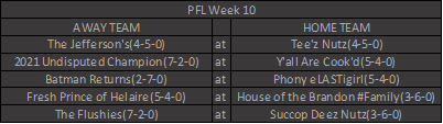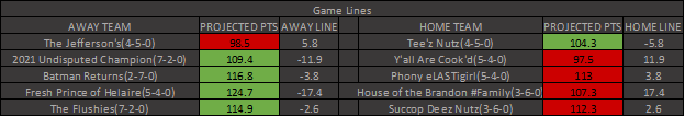 2 interesting L Loser games this week. aLi, who is projected 98.5 vs StrohL, phony of the week. We also have Bummish John vs Dan. This is your last shot to put together a winning streak and dig your way out.