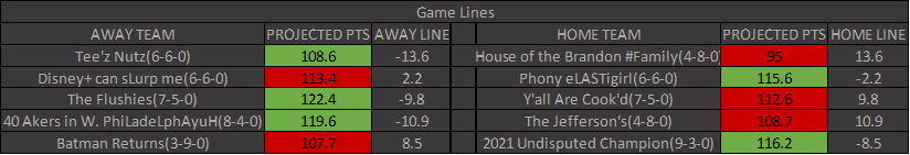 3. Bookie Z – (previous ranking: 1) – Zack’s team has come back to earth in recent weeks, mostly because of the Jamarr Chase injury, but also Lamar hasn’t been quite the same. And that’s not to mention his Tight End. He will really need to massage that position through the waiver wire over the next few weeks. Because everyone knows that you can’t make someone else massage your tight end for you. Well, almost everyone. His team is fine though, and he will be a tough out in the playoffs.