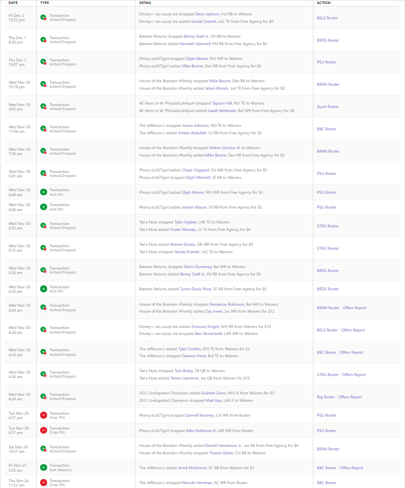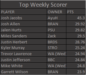 5. Mr. Jody Fortson – (previous ranking: 4) – I have underrated Tom’s squad all year. And I thought to myself, why stop now? He is going to make the playoffs, and then he will lose in the first round. Unless he plays me, then he will definitely win. Like the Giants, he somehow has 7 wins and you’re not quite sure how or why. Anyway, I hate all of Tom’s team right now except for his receivers and maybe Joe Burrow. He should talk to his Giants about the importance of WRs.