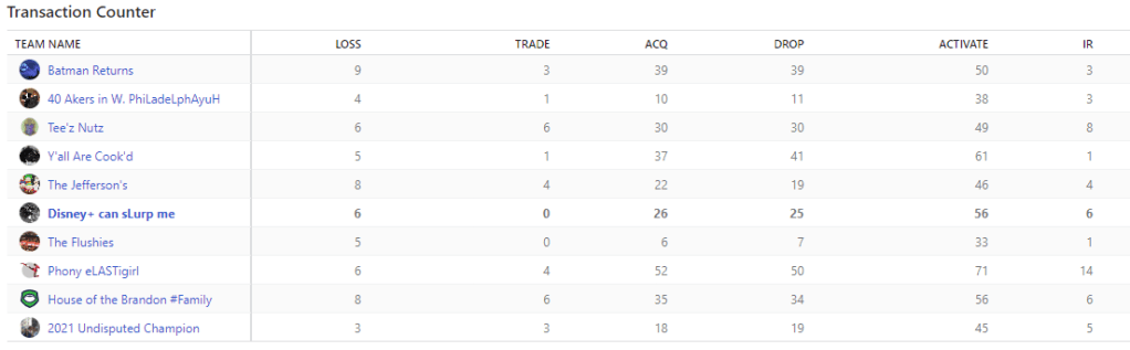 4. King Phony – (previous ranking: 9) – This is my first Hot Take of the week. Just a straight squad vs. squad look, on paper, I would rather have Dan’s team than Tom’s going into the playoffs. The only trouble is, Dan still has to officially make the playoffs. I say that watching this gross MNF game in which he has three starters playing. Although it’s early, I am happy to prematurely declare (and probably jinx) that we will not have our first Princess Phony (that we know of).