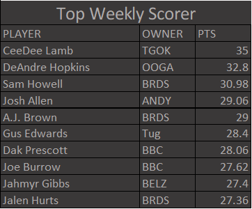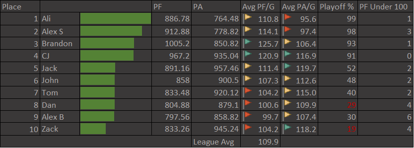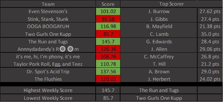 CJ (best team) once again had a great week and was the highest scorer. Our bud Shroomies got a taste of his own medicine going up against 145 points. Regardless, both of these teams are pretty much a lock for playoffs.