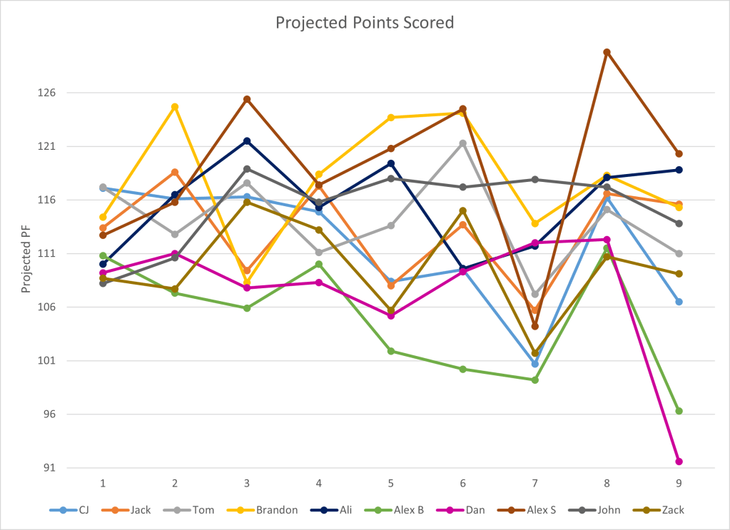 Zack had a real tough loss against John this week. 120 points wasn’t enough to do it this week and that hurts when you’re at the bottom of the standings. Don’t worry bud, Dan and I are coming to keep you company.