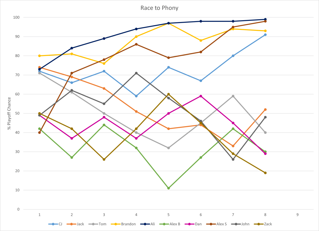 +300 – Candy Man Dan – “The memories of how we did it will fade, and all we’ll remember is that we won the war.” You may say: Jeez, StooL is a learned man (with all those letters behind his name), that quote must be from a famous military strategist like Sun Tzu, Patton, or Winston Churchill. All wrong. I made that quote up right now sitting on my couch thinking about what happened earlier this week. And no I’m not referring to me snatching victory from the Jaws of defeat on Monday night. I’m referring to the rat bastard kid that stole Dan’s candy. Sure, she got caught, but did she put any back? I don’t think so. Dan will lose again this week without Amon Ra and CMC.+350 – Champ Z – Currently at the bottom looking up, The Flushies have scored more points than the two aforementioned phony bracket contenders. HM Ltom avoids this list by mere PF decimals and that “3” in the win column. Zack’s a lock for the phony bracket but I consider him Bran Stark through season 5 of Game of Thrones. I’d bet my life on him not being King…I really should finish the last season of that I guess.