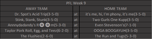 +200 – Father of the Year – Shrooms may have lost his matchup with Tom, but he has won so, so much more. That is – he has had the opportunity to spend as much time as he wanted with his newborn son. While Dan and I (and maybe Jack) have been delinquent in tending to our children over the last few months (or years) because we were busy focusing on football, Shrooms clearly was not. — Wait, sorry, I’m receiving word that Shrooms did in fact score more points than everyone else in the league bar the two teams with byes this week. It’s destiny then. If Shrooms loses this week, his players have very tough matchups for the next two and he could easily be running the ClownK.