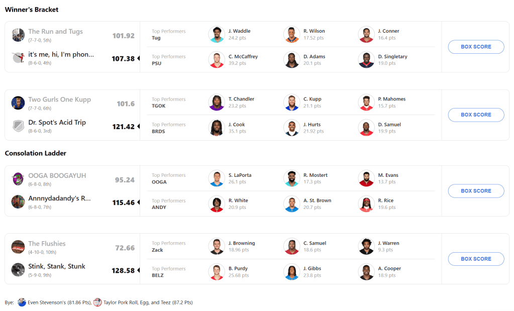 Three teams scored over 1600. The top three totals were 1637, 1636 and 1634. Those totals were for the two, one and seven seeds respectively. The fact that my team scored under 100 and the other two went bananas the final week and the totals are still that close just goes to show that PF really doesn’t matter nearly as much as PA. The Oracle was mocked and laughed at for making that point but like… what more do you want?